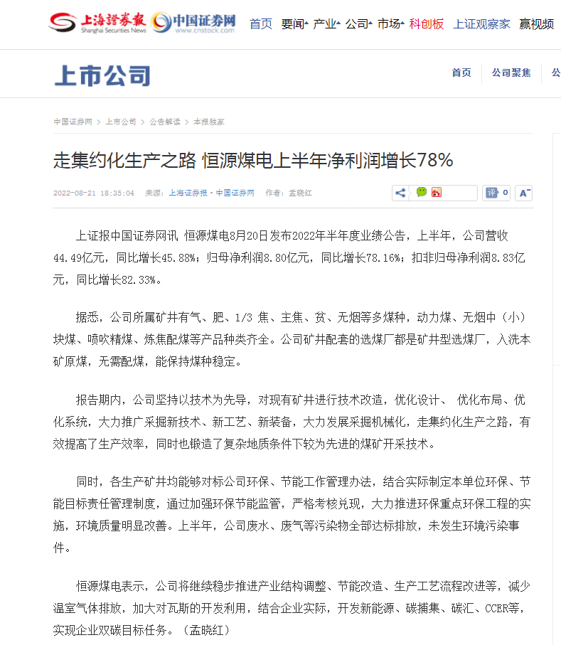 中国证券网2022年8月21日报道,走集约化生产之路 球速体育煤电上半年净利润增长78%