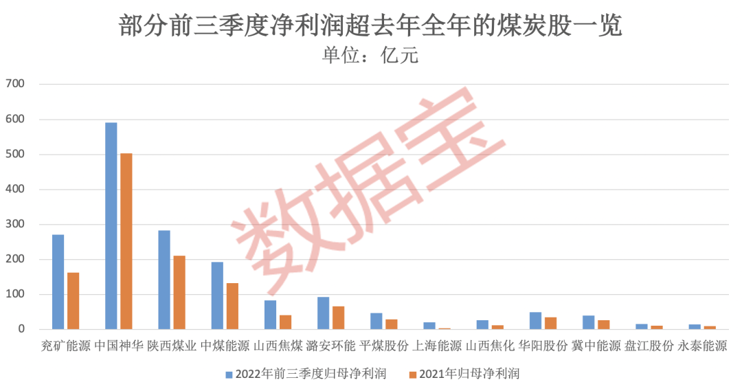 与2021年业绩对比,25股的前三季度归母净利润超过去年全年,占比超六成。兖矿能源持续受益于海内外高煤价,2022年前三季度实现归母净利润271.28亿元,比去年全年多了108.69亿元。此外,受益于电价上涨,公司电力板块毛利率相比去年同期的2.59%,提升至15.36%。中国神华、陕西煤业、中煤能源的前三季度归母净利润均较去年全年增长超60亿元。