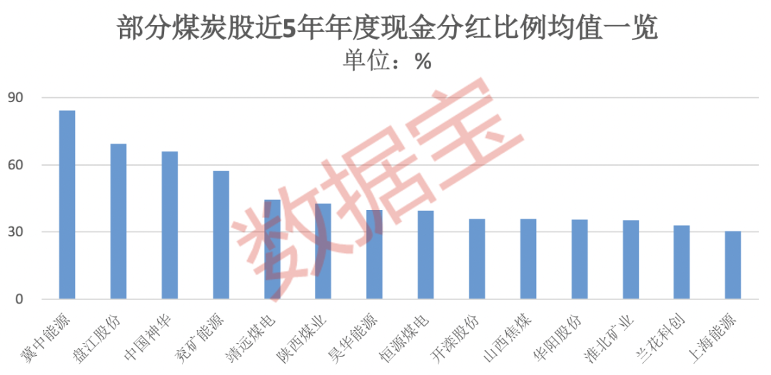 数据宝统计,近五年连续实施现金分红的煤炭股有17只。按照年度现金分红比例的均值,冀中能源的平均分红比例最高,达84.37%。盘江股份、中国神华的近五年平均分红比例均超65%。