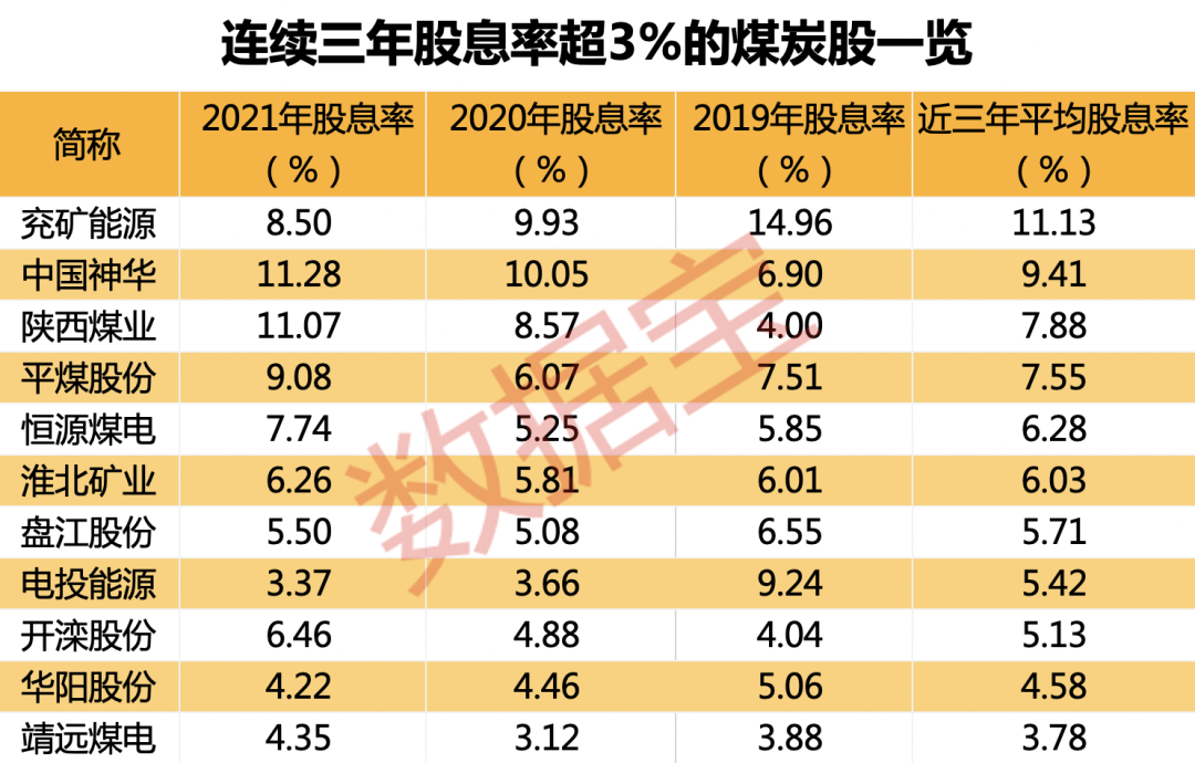 数据宝统计,过去三年股息率均超过3%的煤炭股共有11只,其中9股过去三年股息率平均值超过5%。