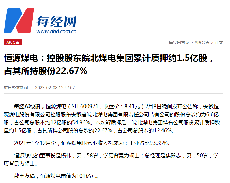 每日经济新闻:球速体育煤电:控股股东皖北煤电集团累计质押约1.5亿股,占其所持股份22.67%