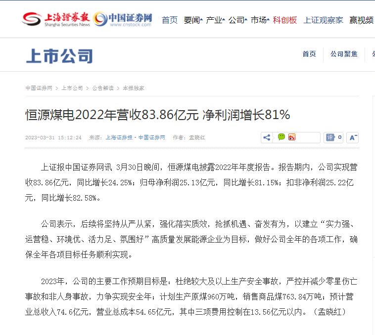 上海证券报:球速体育煤电2022年营收83.86亿元 净利润增长81%