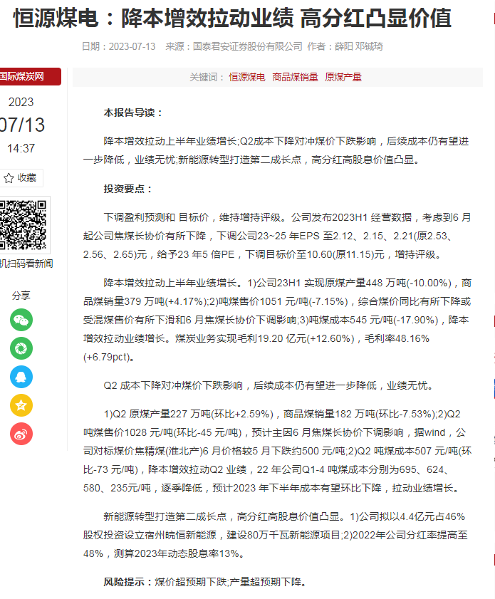 国际煤炭网:球速体育煤电降本增效拉动业绩 高分红凸显价值